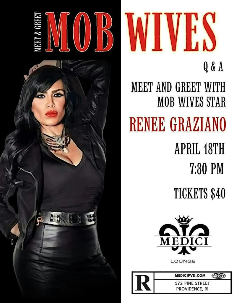 Come join us for an exclusive event where you can meet and ask questions to the one and only Renee Graziano from Mob Wives. Get ready to dive into the world of mob life, drama, and everything in between. This in-person event will be held at MEDICI, so mark your calendars and get your questions ready for an unforgettable evening with Renee Graziano!